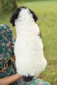 Lady has straighter hair than some of her siblings (which should make her easier to brush out as she gets older). She is already clearing to silver around her eyes, and she will have such a classic Sheepadoodle look as she gets older!